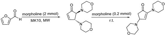 2,4-Diamino cyclopent-2-enone, a by-product observed in the cyclization, was obtained at room temperature or in the absence of a catalyst (Table 1, entries 1 and 6) after a long reaction time. As previously observed [57,60], the conversion of 4,5-diamino cyclopentenone to 2,4-diamino cyclopentenone was performed in the presence of an excess of amine. To investigate the catalytic activity of MK10 and its selectivity, we tested the performance of trans-4,5-dimorpholinocyclopent-2-enone in the presence of a small amount of morpholine, to obtain 2,4-dimorpholinocyclopent-2-enone (Scheme 2).