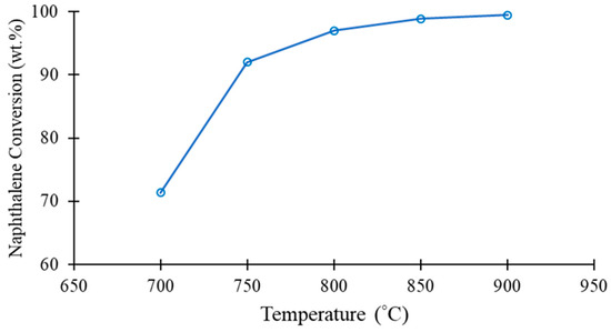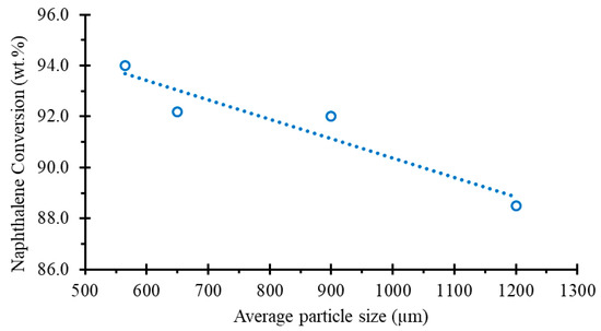 Figure 8 shows the impact of the char particle size on naphthalene conversion at 750 °C. It was found that doubling the average particle size reduced the naphthalene conversion by only 5.5 wt.%. Therefore, it is difficult to confirm that the internal mass transfer limitations were negligible. However, we can more accurately say that there were no internal mass transfer limitations in the larger pores.