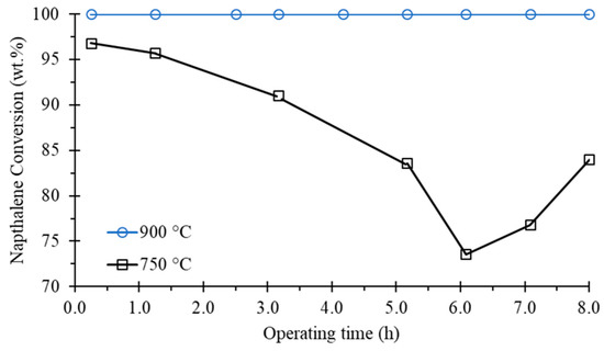Figure 3 shows the impact of reactor temperatures of 750 °C and 900 °C on the conversion of naphthalene during the eight hours experimental operating time. The naphthalene conversion at 900 °C remained at almost 100 wt.%, which can be related to the high activity of char at this temperature and the continuous activation of char with steam and CO