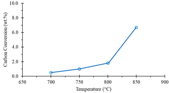 Figure 4. The increased carbon conversion from 2 wt.% at 800 °C to 7 wt.% at 850 °C indicates that the bed temperature is a key parameter, which is an indication that the reaction is kinetically limited.