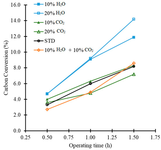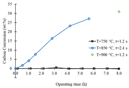 At 850 °C and a longer gas residence time (2.4 s), the carbon conversion increased to 27 wt.% after 5.7 h operating time. However, it was better to vary one parameter only (temperature) and fix the value of gas residence time because both of them have a positive influence on carbon conversion.