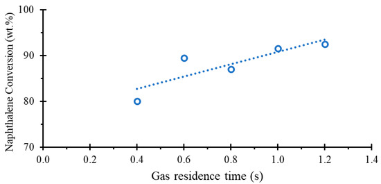 Figure 6 shows the impact of the gas residence time on the conversion of naphthalene at a relatively low reactor temperature of 750 °C. The small increase in the naphthalene conversion can be related to the narrow range of the studied gas residence time.