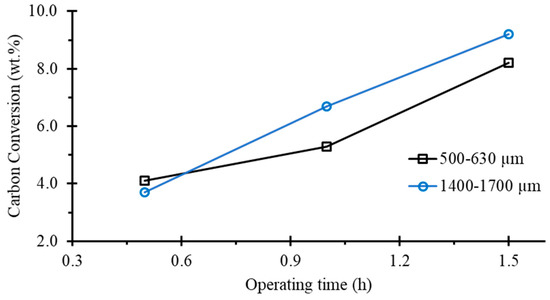 Figure 9. In this test, two char particle sizes were used: 500–630 µm and 1400–1700 µm. As found with naphthalene conversion, only a limited effect on carbon conversion (<1%) was attained. Therefore, it is also difficult to confirm here that the internal mass transfer limitations were negligible. However, it may be more accurate to say that there were no internal mass transfer limitations in the larger pores.