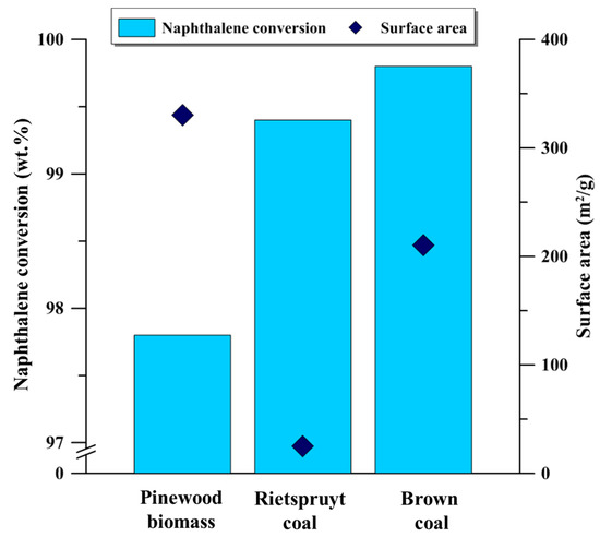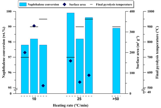 Figure 10. It was found that the highest naphthalene conversion (99.9 wt.%) was attained at 25 °C/min heating rate and 700 °C final pyrolysis temperature. However, it was difficult to draw conclusions on the impact of surface area at such high naphthalene conversions. On the other hand, these selected conditions were often used in hot gas catalytic cleaning processes.
