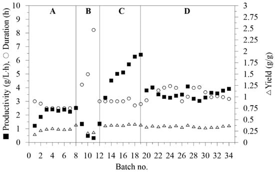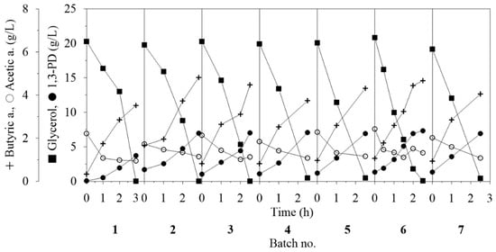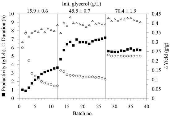 In an attempt to achieve a higher 1,3-PD productivity, the initial concentration of crude glycerol was increased to 41.5 ± 2.3 g/L (Figure 4B). While no significant performance changes were observed in the first fermentation, after this change (Figure 4, Batch no. 8), in the consecutive batches, productivity decreased rapidly to as low as 0.32 g/(L·h) in the three successive batches, and fermentation time increased to as high as 8.2 h, by the fourth fermentation (Figure 4, Batch no. 11).