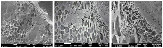 The adsorption of bacteria onto the surface of the empty PVA particles was confirmed by electron microscopy. The PVA hydrogel lenses allow bacteria to grow within the particles and offer a near optimal environment for bioconversions [30]; they also provide a surface that free cells can grip onto, thereby colonizing the PVA matrix. Cell colonization of the empty pores of hydrogel matrix can be observed in the picture taken at 500× magnification, shown in Figure 3, inset A (short arrows), which displays the cross-section of a PVA particle after the 20th repeated batch. Colonization appeared to be most frequent in areas close to the surface (top right) and was significantly lower in the middle part (long arrow) of the PVA particle (bottom left).