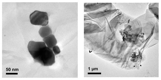 Two catalysts supported on GO, Pd/GO-A and Pd/GO-B, were obtained by different procedures. Pd/GO-A was prepared from PdCl2 as the palladium source, in an acetonitrile solution at RT without any additional reducing agent. The TEM analysis evidenced the presence of 34–89 nm Pd NPs, partially agglomerated (Figure 1). Characteristic lines of the crystalline Pd NPs and GO were observed in the XRD picture (Figure 2). The second palladium catalyst, Pd/GO-B, was obtained according to the literature method [], using Pd(OAc)2 as the substrate and a sonication step as part of the synthetic procedure. The obtained composite, Pd/GO-B, contained Pd NPs of ca. 8–9 nm in diameter with a relatively narrow size distribution (Figure 3). The palladium content in Pd/GO-B was higher than in Pd/GO-A according to the ICP analysis. On the other hand, an EDX analysis showed lower Pd content values on the surface of Pd/GO-B than on the surface of Pd/GO-A.