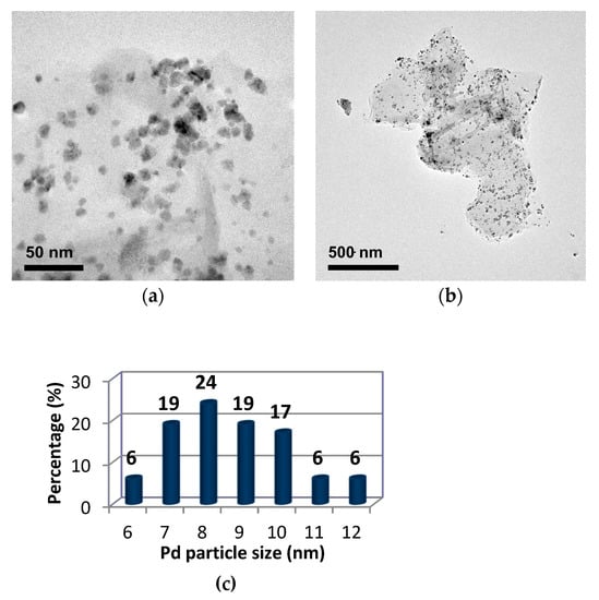 TEM pictures (a,b) and Pd NPs size distribution (c) for Pd/GO-B.