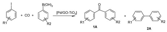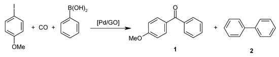 The activity of Pd/GO and Pd/GO-TiO2 catalysts was investigated in the carbonylative Suzuki–Miyaura cross-coupling of 4-iodoanisole with phenylboronic acid at 1 atm of CO (Figure 4, Table 1).