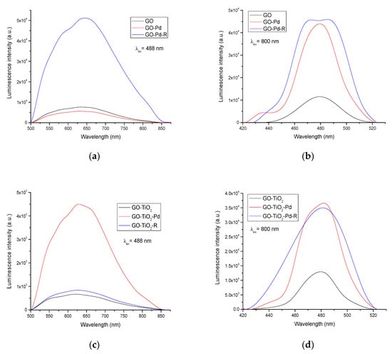 The addition of Pd to GO and GO-TiO2 materials caused a remarkable increase in emission intensity for λex = 800 nm and 445 nm. The same effect was also noted using λex = 488 nm for GO-TiO2, while grafting of Pd on GO did not change this emission intensity. The enhanced blue emission after the introduction of Pd indicated the reduction of GO and increase in the number of π-electrons [].