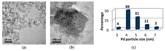 ICP measurements of the palladium content were performed using an ARL 3410 model spectrometer. TEM measurements were carried out using a FEI Tecnai G2 20 X-TWIN electron microscope operating at 200 kV (Waltham, MA, USA).