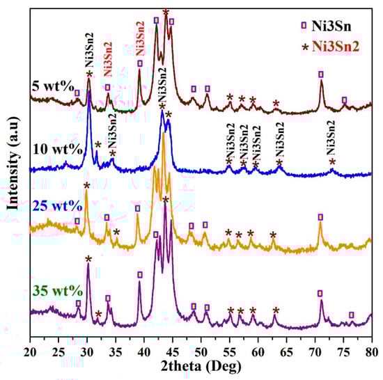 In each formulation, the ratio between Ni3Sn and Ni3Sn2 almost matches the ratio between the intensities of the main peaks (R) in the XRD pattern, i.e., R = NiNi3Sn/NiNi3Sn2, then if there is no free Ni: