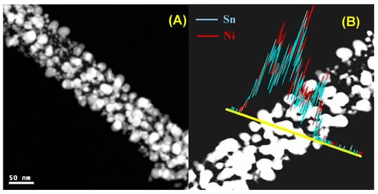 TEM image (A), and EDX line scan (B) for the prepared Sn-incorporated nanofibers; 10 wt % and 850 °C calcination temperature.