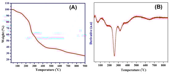 Thermal gravimetric analysis (TGA) (A), and first derivative for the TGA data (B) for an electrospun mat containing 10 wt % tin precursor.