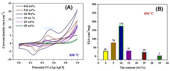 Figure 5A demonstrates the cyclic voltammograms for nanofibers with different tin contents and that were calcined at 700 °C. As shown, the Ni(OH)2/NiOOH transformation peaks are clearly observed for all formulations. The ESA can be calculated from the obtained graphs according to the following equation [62,63,64]