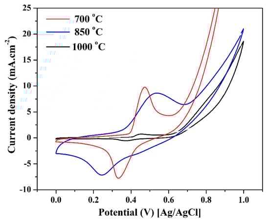 To properly investigate the influence of the synthesis temperature, Figure 7 shows a comparison between three synthesis temperatures for nanofibers containing 10 wt % Sn. As can be concluded from the figure, further increase in the synthesis temperature (to 1000 °C) does have a negative influence on the area of the cathodic peak and consequently on the ESA. Numerically, the determined ESA formed on the surface of the nanofibers prepared at 700, 850, and 1000 °C is 110, 175, and 25 cm2/mg, respectively. Paradoxically, the sample with 15 wt % co-catalyst reveals very high ESA when synthesized at 700 °C compared to 850 °C (Figure 5A and Figure 6A). However, all the samples synthesized at 1000 °C revealed very low ESA values compared to the other two temperatures; data are not shown. Accordingly, it can be concluded that the optimum synthesis temperature is either 700 or 850 °C according to the nanofiber composition. Another important finding that can be observed from these results is the shift of the cathodic peak to the negative potential direction in the case of the nanofibers containing 10 wt % Sn and synthesized at 850 °C. This shift leads to a distinct decrease in the onset potentials of the electrooxidation process.