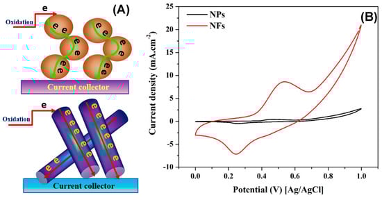 Figure 12 displays a good translation for the results obtained in Figure 8 (influence of the nano-morphology on the ESA), and simultaneously supports the aforementioned hypothesis about the role of the axial ratio in enhancing the electron transfer process. As shown in the figure, for both methanol and urea, the nanofibrous morphology provides an advantage for the investigated electrocatalyst in enhancing the electrocatalytic activity toward oxidation of methanol (Figure 12A) and urea (Figure 12B).