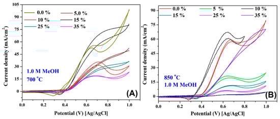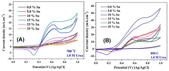 To scientifically prove the influence of the ESA on the electrocatalytic activity of the proposed composites, the performance of the proposed materials toward the electrooxidation of methanol and urea was investigated. Figure 9 displays the electroactivity of the prepared nanofibers at different Sn contents prepared at 700 and 850 °C toward methanol oxidation (1.0 M methanol in 1.0 KOH, scan rate 50 mV/s). As shown in Figure 9A, the nanofibers owing the maximum ESA (15 wt % Sn and prepared at 700 °C) reveal the best activity. Similarly, in the case of the 850 °C calcination temperature, the best performance was associated with the maximum ESA, with the nanofibers containing 10 wt %. However, at the two temperatures, the performance does not follow the ESA order. For instance, for the two temperatures, the second best performance is associated with the Sn-free nanofibers. Moreover, for the remaining Sn-containing nanofibers, the electro-catalytic activity sequence does not follow the ESA order for the two temperatures. This result draws the attention toward an important conclusion, that NiOOH is not the main tool for the methanol oxidation. In other words, as was concluded in our previous study, methanol can be oxidized on the surface of the un-activated nickel electrode with simultaneous formation of NiOOH [23]. Therefore, the current study supports our previous one and introduces a new understanding for methanol oxidation. However, the two studies confirm that the NiOOH-based mechanism is essential but not unique. Beside this new finding, there is another one that can be extracted from Figure 9B. As shown, there is good enhancement in the methanol oxidation onset potential in the case of the nanofibers containing 10 wt % Sn and prepared at 850 °C. It is important to link with the negative shift observed during the activation of these nanofibers (Figure 6A). In more detail, the formation potential of the NiOOH affects the methanol oxidation onset potential. This finding is very important from an application point of view. Decreasing the onset potential is highly preferable in the case of production of hydrogen from methanol using the electrolysis process because it results in decreasing the required power.
