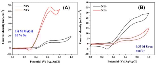 Influence of the nanostructural morphology on the electrocatalytic activity of 10 wt % Sn nanofibers prepared at 850 °C toward oxidation of methanol (1.0 M in 1.0 KOH) (A) and urea (1.0 M in 1.0 KOH); (B) the measurements were performed at room temperature and a scan rate of 50 mV/s.