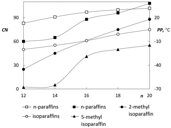 A key process for obtaining hydrocarbons is hydroisomerization. This is a radical reaction where branching of hydrocarbon molecules is achieved by the use of form-selective catalysts, such as zeolites or other acid catalysts. N-paraffins having a boiling point corresponding to diesel fuel generally have a higher cetane number than their branched isomers. In contrast, isoparaffins have lower solidification points than n-paraffins. Therefore, there is a compromise in the quality of the paraffin-rich fuel; the fuel has either good combustion properties, or good low-temperature properties. The result of hydroisomerization is therefore a fuel with a lower solidification point and a lower cetane number. The relationship of these two properties is illustrated in Figure 3 [22].