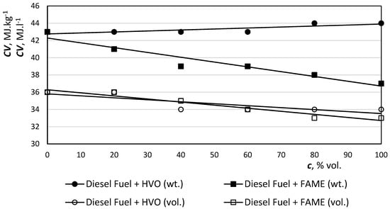 Figure 4 shows that the density with increasing HVO concentration in the mixture is expected to decrease. This is due to the lower permissible water content and paraffinic character with a higher hydrogen content than diesel, which results in a higher energy content per kg. Mixture of diesel fuel with HVO > 30% vol. exceeds the EN 590 (Table 1) limit for diesel (820–845 kg·m−3). High proportion mixtures did not meet the standard limits. On the contrary, low density offers the possibility of blending HVO into diesel fuels with higher contents of heavier fractions, or their incorporation into less profitable products, such as fuel oil. Conversely, all HVO mixtures meet standardized kinematic viscosity limits.
