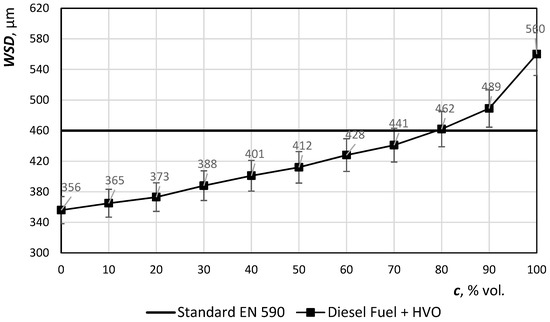 On the y-axis, lubricity (WSD—wear scar diameter) is in μm. HVO has very low lubricity, therefore up to 80% of the volume may be added as maximum. Once the concentration reaches 80% or more, the mixture of the fuel does not match the EN standard—see Figure 6. It could lead to seizure of the fuel system of the machine.