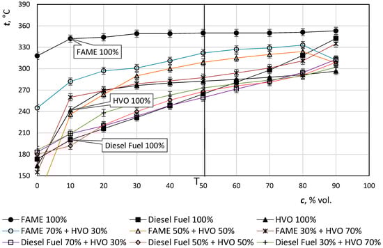 Distillation curves of FAME, diesel fuel, HVO and their mixtures.