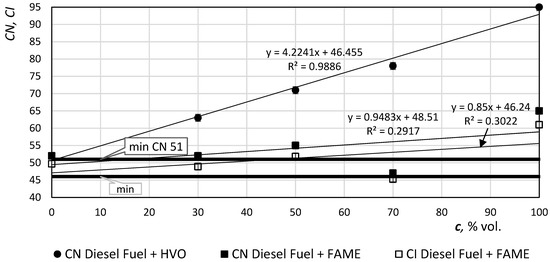 Figure 11 shows the increasing trend lines of the cetane number and cetane index with increasing HVO content. The cetane number of hydrotreated vegetable oils ranges from 75 to 95 units due to the composition (n-paraffins and isoparaffins). In mixed fuels, there is a linear increase in the cetane number, corresponding to the proportion of components. Hydrotreated oil is a suitable additive for increasing the cetane number due to the nature of the fuel, where its effect is greater than the use of conventional additives. For measuring the cetane number on the test engine, the hydrotreated oil must be mixed with a fuel with a known and low cetane number, such that the cetane number of the resulting mixture is below 70 units within the measuring range. Then, the cetane number of the hydrotreated vegetable oil is determined by linear extrapolation. The calculation of the cetane index is suitable for standard diesel fuels (with FAME) and its use for hydrotreated oils is not appropriate.