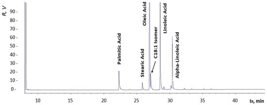 Chromatogram of 100% FAME with identified main components (methyl esters).