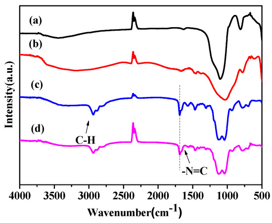 The FT-IR characterization of the fresh Pt0.5/SiO2 and Pt0.5/SiO2-Shiff has been performed to clarify the surface moieties of the catalysts. As seen in Figure 3, for the Pt0.5/SiO2 catalyst, only characteristic absorption bands for the pure SiO2 are detected, that is, the band at 1107 cm−1 is assigned to the antisymmetric stretching vibration of the Si-O. In contrast, for the Pt0.5/SiO2-Shiff catalyst, additional bands at 2869 and 2927 cm−1 can be assigned to the symmetric and asymmetric vibrations of the -CH2 groups. The N-H moiety vibration band is observed at 934 cm−1, which is attributed to the uncondensed amino group. In addition, the appearance of the Schiff base (-N=C) band at 1695 cm−1 indicates the successful graft of Schiff base on the surface of SiO2 support [35].
