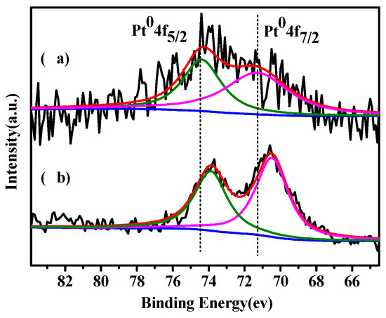 XPS was further performed to characterize the electronic properties of Pt NPs. For the fresh 0.5 wt % Pt/SiO2 (Figure 4a), the binding energy centered at 74.39 and 71.19 eV can be assigned to Pt4f5/2 and Pt4f7/2 of Pt0, respectively. While for the 0.5 wt % Pt/SiO2-Shiff catalyst (Figure 4b), the binding energy of Pt4f5/2 and Pt4f7/2 of Pt0 shifted to 73.89 and 70.49 eV. Such a negative shift can be attributed to the electron donation from nitrogen atom to Pt [36,37]. Therefore, there is a strong interaction between the Pt NPs and the organic groups on SiO2-Schiff.