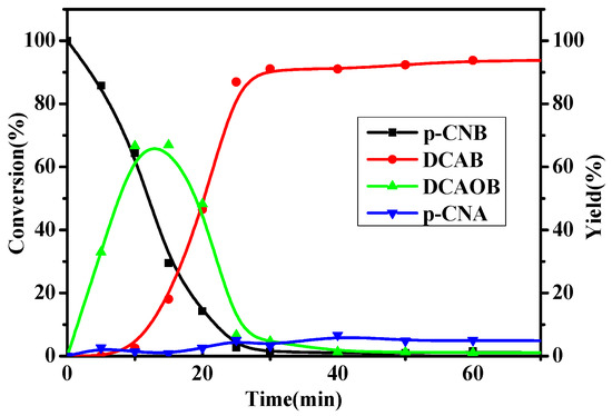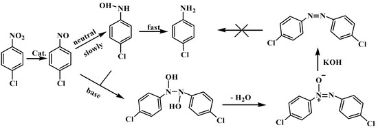 To explore the reaction mechanism, the evolution of product distribution was monitored with the reaction time (Figure 5). As we can see, the DCAOB intermediate was predominant at the initial stage, which is further transformed into DCAB. The other hydrogenative intermediates, such as nitrosobenzene and phenylhydroxylamine, are not detected. Based on the above experimental results, the mechanism of the hydrogenation of p-CNB to the corresponding DCAB is proposed in Figure 6, which is consistent with the literature report [31,42]. The Schiff base promotes the adsorption of p-CNB, and the Pt NPs are served as active sites to activate H2. The H on the Pt surface reacts with the adsorbed p-CNB to generate p-CNA, which would be converted to 4-chloro-N-hydroxybenzenamine. This 4-chloro-N-hydroxybenzenamine can be easily reduced to aniline under a neutral condition, and no coupling product was detected in our experiments. However, when a base is added, the generated 4-chloro-N-hydroxybenzenamine will quickly couple with nitrosobenzene to form 4,4′-dichloro-N,N′-dihydroxy-diphenylhydrazine. This dihydroxy intermediate is then dehydrated to give DCAOB and further hydrogenated to DCAB under strong alkali environment. As a result, DCAB is the only observed coupling product.