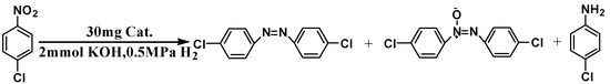 Generally, the catalytic activity and selectivity are sensitive to the base employed in the formation of Aazo [27,28,29,38,39,40,41]. In our results, the amount and strength of the base have also a great influence on the catalytic nitroaromatic hydrogenation. Without the presentation of base, the p-chloroaniline (p-CNA) is the main product (with a selectivity of 97.3%) at 96.5% conversion of nitrobenzene. Once the base was added in the reaction system, even with a weak base, such as K2CO3 and Na2CO3, DCAOB and p-CNA would become the main products. As a strong base, such as KOH, was used in the reaction, DCAB was then served as the main product, suggesting that a strong base was indispensable in the course of DCAB formation. The basic additive changes the reaction pathway of the nitroaromatic hydrogenation, in which the dehydration coupling reaction of the aromatic hydroxylamine compound with the aromatic nitroso compound to form an oxygen azo compound is promoted. Subsequently, the oxygen azo compound is further hydrogenated to form an azo compound, enhancing the selectivity to the DCAB. In addition, the amount of KOH significantly affects the product selectivity (Table 1), and the superior yield (91.1%) of DCAB is achieved when 2.0 equivalents of KOH is used, which is the most effective way so far for the azobenzene synthesis.