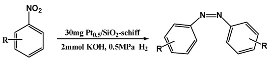 To demonstrate the general applicability of this Pt/SiO2-Schiff catalyst, a series of nitroaromatic compounds in the synthesis of Aazo (Scheme 2) were tested. As shown in Table 3, most of the substituted nitrobenzenes can result in good performance, especially for the compounds with the presence of electron-withdrawing substituents. With an electron donative group such as alkyl (methyl), arylamine (a yield of 49.7%) is the predominant by-product. While the yield of Aazo can up to 86.1% when i-propanol is used as a solvent and the reaction temperature is raised to 90 °C. The unsubstituted nitrobenzenes are relatively inert in the Aazo formation at the given conditions (50 °C, 0.5 MPa H2), and the major by-product is azoxybenzene (yield 58.7%). However, it can convert to azobenzene with a yield as high as 84.7% at the higher reaction temperature (90 °C). Moreover, steric properties of the substituent also significantly affect the reaction. Specifically, the yield of p-substituted azo arene is higher than that of the corresponding m-substituted azo arene (Table 3, entry 5 and 6). Halogenated nitroarenes can be readily converted to corresponding azo compounds without any dehalogenation, while a side reaction is often unavoided in the conventional hydrogenation condition.