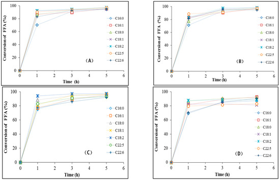 Considering that lipase might show a substrate specificity towards different FFAs, the conversion of different FFAs, including PUFAs, was further compared, as shown in Figure 15.