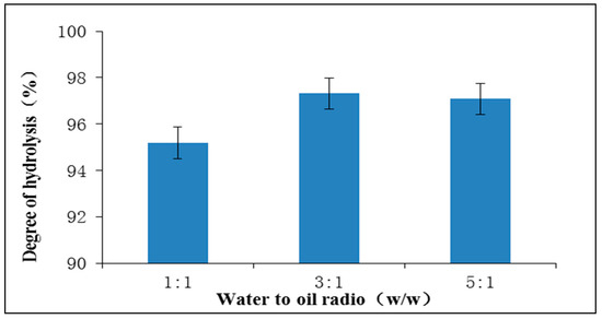 The ratio of water to oil also affects the degree of hydrolysis. The different ratios of water to oil were set as 1:1, 1:3, and 1:5. The results are indicated in Figure 10.