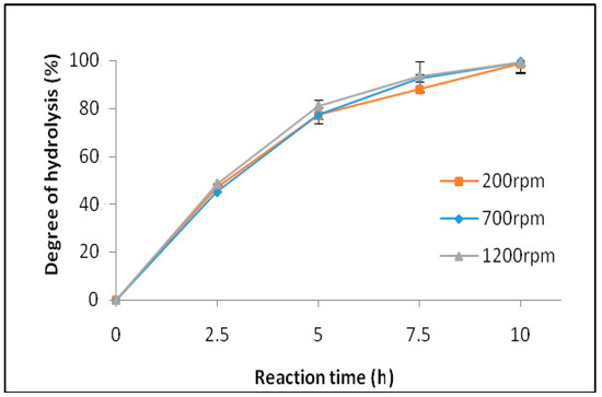 Stirring speed is one of the most considerable factors, because oil hydrolysis is an interface chemical reaction and the stirring speed might affect the mass transfer during the reaction [22]. The stirring speeds of 200 rpm, 700 rpm, and 1200 rpm were studied in the hydrolysis (Figure 12). The results suggested that the stirring speeds tested had no obvious effect on the acid catalytic hydrolysis on Schizochytrium sp. oil, and similar reaction rates and degree of hydrolysis (DH) were observed in all cases.