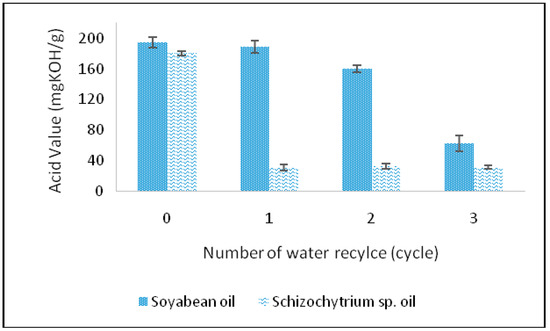 The effect of water recycling on the soybean oil and Schizochytrium sp. oil after the hydrolysis process is compared in Figure 13.