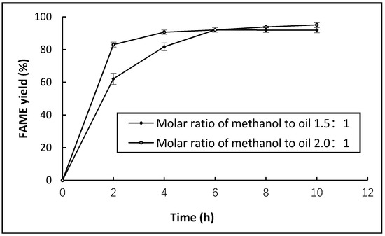 As Figure 14 suggested, the hydrolysed microalgae oil could be effectively converted to methyl esters and a fatty acid methyl yield (FAME) of 95.1% could be achieved at a molar ratio of methanol to oil of 2:1. During the reaction process, 3Å molecular sieves (1.2:1, w/w, based on oil weight) were used to remove the water that could cause the reverse of esterification [35,36].