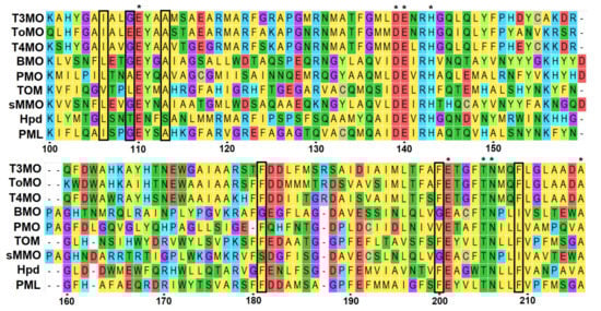 The protein sequence alignment between well-studied SDIMOs α subunits. Toluene 3-monooxygenase (T3MO) of Ralstonia picketii PKO-1, toluene-o-xylene monooxygenase (ToMO) of Pseudomonas stutzeri OX1, toluene 4-monooxygenase (T4MO) from Pseudomonas mendocina KR1, butane monooxygenase (BMO) from Thauera butanivorans, propene monooxygenase (PMO) from Mycobacterium sp. M156, toluene 2-monooxygenase (TOM) from Burkholderia cepacia G4, soluble methane monooxygenase (sMMO) from Methylococcus capsulatus Bath, 2-hydroxypyridine 5-monooxyganase HpdABCDE (Hpd) from Burkholderia sp. MAK1, PmlABCDEF (PML). The numeration is based on PML protein sequence.