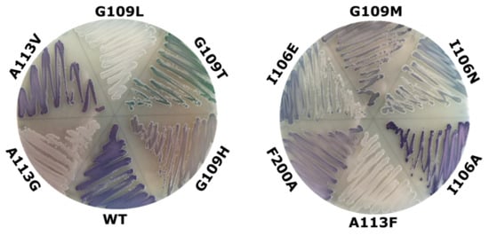 To select potentially improved/changed enzymes from the library of mutants a convenient method was required. Aforementioned studies used a direct screening based on transformation of the appropriate substrate. The nylon membrane assay was used to visually inspect the color development by the end products (hydroquinone, resorcinol, catechol and their derivatives) produced by different mutants []. The PML similar approach seemed impractical as the majority of the potential N-oxides likely are not intensely colorful and would not stain bacterial colonies. However, SDIMOs are able to convert indole into a variety of pigments (indigo, indirubin, isoindigo) and colorful hydroxyindole derivatives (isatin, 6-hydroxyindole, 7-hydroxyindole). On the other hand, an altered indole oxidation specificity after the mutagenesis of TOM, ToMO and T4MO, induced the formation of different pigments [,,]. It enabled the selection of distinct mutants on the base of diverse color development. We hypothesized that PML mutants with an altered oxidation regiospecificity of indole might possess different N-oxidation patterns as well. Hence, in total, nineteen differently colored colonies were selected (Figure 3). Five distinct coloration patterns were observed in the case of the I106 library. Sequencing of individual hits revealed that three different enzymes were created. I106N was selected two times, 106E was selected one time, and I106C also was selected two times. In addition, I106A mutant was created by site-direct mutagenesis separately. From the A113 library, we were able to distinguish five differently hued colonies. Sequence analysis of hits uncovered them as A113G (two times), A113V (one time) and A113F (two times). The G109 library produced the greatest coloration variety as nine different variants were selected in total. They were identified as G109M, G109Q, G109H (one time) and G109L, G109K, G109T (two times). Then those new enzymes were tested for their catalytic properties towards various N-heteroaromatic compounds.