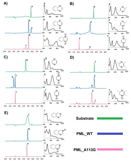 In addition, this mutant was able to almost completely convert 2,3,5-trimethylpyrazine (Figure 4D) to a single compound (92% conversion using 1.0 mM of a substrate), which was later identified as 2,3,5-trimethylpyrazine-1-oxide. Production of latter by the wild type enzyme barely reached 6% conversion. The most distinct feature of the A113G mutant was the changed regioselectivity of N-oxidation. Quinazoline was oxidized by parental PML to quinazoline-3-oxide exclusively []. However, the A113G mutant transformed this substrate to the product with different retention time and UV spectra (Figure 4E), which indicated the formation of a new compound. After isolation and NMR analysis (Supplementary Materials), the product was confirmed as quinazoline-1-oxide, demonstrating a shift of oxygen attack from N3 to N1 position.