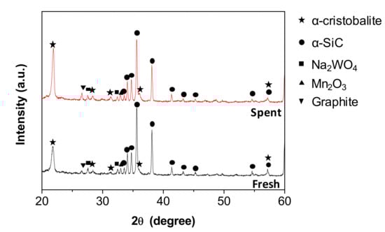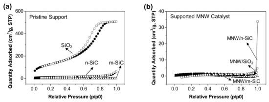 Two SiC supports with particle sizes of 45–65 nm and 14 µm were purchased from US Research Nanomaterials and Alfa Aesar, respectively. These SiC samples are denoted n-SiC and m-SiC, respectively. SiO2 (Alfa Aesar, Haverhill, MA, USA), Mn(NO3)2·6H2O (Kanto Chemical, Tokyo, Japan), and Na2WO4·2H2O (Yakuri Pure Chemicals, Kyoto, Japan) were used as received.