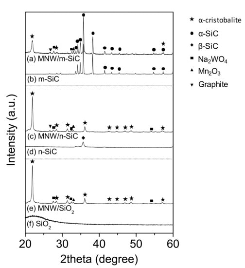 X-ray diffraction patterns of (a) MNW/m-SiC; (b) m-SiC; (c) MNW/n-SiC; (d) n-SiC; (e) MNW/SiO2; and (f) SiO2.