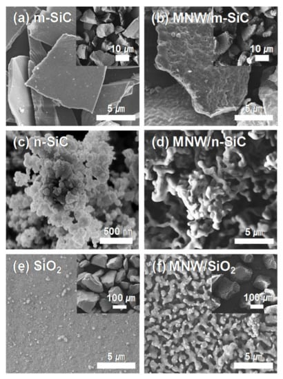 The scanning electron microscope (SEM) images of pristine supports and supported Mn2O3-Na2WO4 catalysts: (a) m-SiC; (b) MNW/m-SiC; (c) n-SiC; (d) MNW/n-SiC, (e) SiO2; and (f) MNW/SiO2.