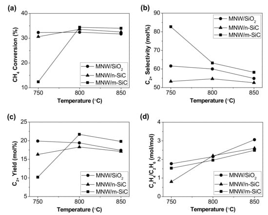 The catalytic activity for OCM reaction over MNW/n-SiC, MNW/m-SiC, and MNW/SiO2 catalysts as a function of temperature. (a) CH4 conversion; (b) C2+ selectivity; (c) C2+ yield; and (d) C2H4/C2H6 ratio (feed composition: CH4/O2/N2 = 3/1/1, GHSV = 10,000 h−1).