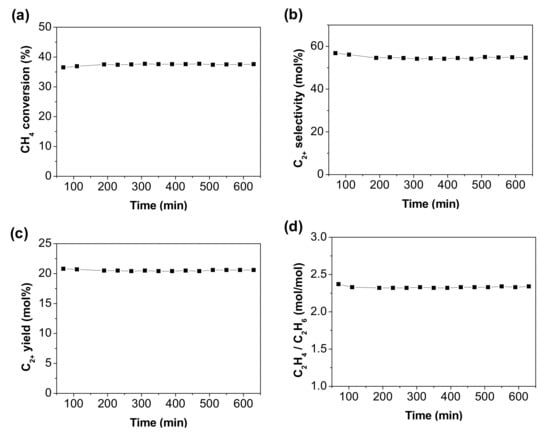 The catalytic activity for OCM reaction over MNW/m-SiC catalyst at 800 °C with time-on stream. (a) CH4 conversion; (b) C2+ selectivity; (c) C2+ yield; and (d) C2H4/C2H6 ratio (feed composition: CH4/O2/N2 = 3/1/1, GHSV = 10,000 h−1).