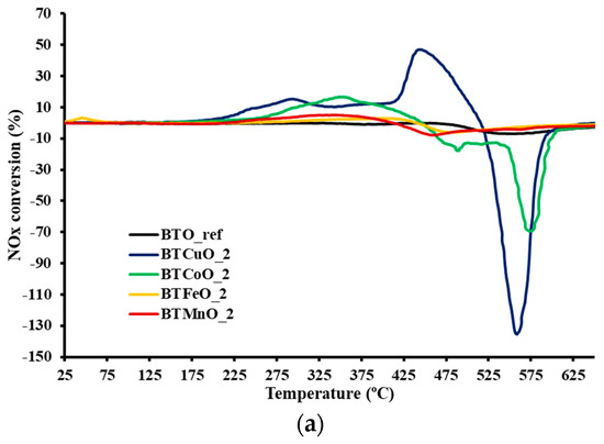 Thus, all the BaTi0.8B0.2O3 perovskite catalysts increase the rate of NO2 generation percentage at low temperature as the %NO2 generated is higher than that shown by the BTO perovskite used as a reference (BTO_ref in Figure 3a,b). However, a deeper analysis of the data reveals some significant differences in the NO2 profiles of the catalysts. Firstly, BTFeO_2 and BTMnO_2 catalysts feature Gaussian-shape NO2 generation profiles with maxima at around 470 °C. Considering that almost any significant NOx adsorption/desorption activity is observed for these catalysts, it can be suggested that they are mainly active for NO to NO2 oxidation (however, NOx adsorption capacity cannot be totally ruled out due to the intrinsic characteristics of TPR experiment). Secondly, although BTCoO_2 catalyst presents a similar type of NO2 generation profile, it shows the highest NO oxidation activity, which seems to be related to the presence of Co3O4, as metal oxides are active for the NO to NO2 oxidation reaction [11,12,14,15,16]. In addition, the low intensity NOx conversion peaks observed for BTCoO_2 catalyst in Figure 3a, indicates a low NOx adsorption activity that, according to literature [14,15,16], could be due to the presence of minority segregated phases and oxygen vacancies. Finally, a different NO2 generation profile with two maxima and a minimum (at ca. 421, 507, and 441 °C, respectively) are clearly identified for BTCuO_2 catalyst. It is worth indicating that the temperature of the minimum NO2 generation perfectly matches with the temperature of the maximum NOx conversion observed for this catalyst in Figure 3a. This result points out that, at this temperature, BTCuO_2 shows higher NOx adsorption rate than NO oxidation rate as Ba2TiO4 phase, which is active for NOx adsorption [11,12], has been identified.