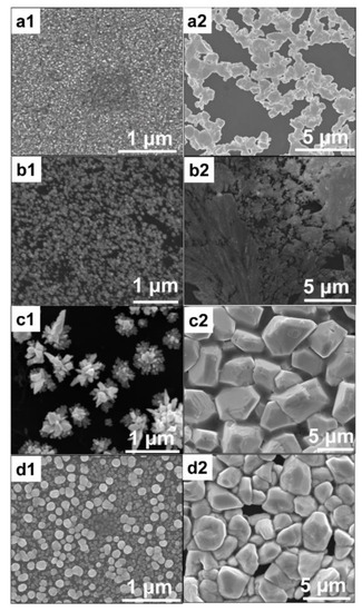 Figure 1a1–d1 shows SEM images of the prepared Pd, Au, Pt and Cu electrodes, respectively. The metal loading amount was estimated ca. 0.51 μmol cm−2 for each electrode. The Pd, Pt and Cu electrodes show that the metal nanoparticles are well dispersed on glassy carbon (GC). The metal particle size is listed in the order of Pd < Pt < Cu < Au. The Au electrode exhibits that the shape of Au particles is like a bloomy bud. When Hg was deposited on each metal electrode with the Hg/M atomic ratio of 8, the morphology of each metal particle abruptly changed as shown in Figure 1a2–d2. Pd amalgam on the PdHg800 electrode looks like liquid-like metal spread on GC and Pt amalgam on the electrode looks like a paste. It is interesting to see that Au amalgam and Cu amalgam on have a similar morphology compared to polygons.