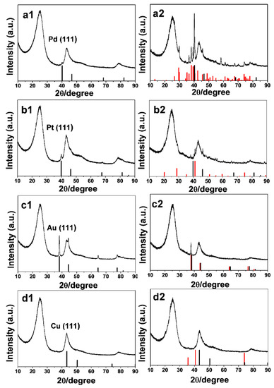 XRD result of the electrodeposited metals and corresponding amalgams, (a1) Pd, (a2) PdHg800, (b1) Pt, (b2) PtHg800, (c1) Au, (c2) AuHg800, (d1) Cu and (d2) CuHg800: (black) metal, (red) Hg alloy.